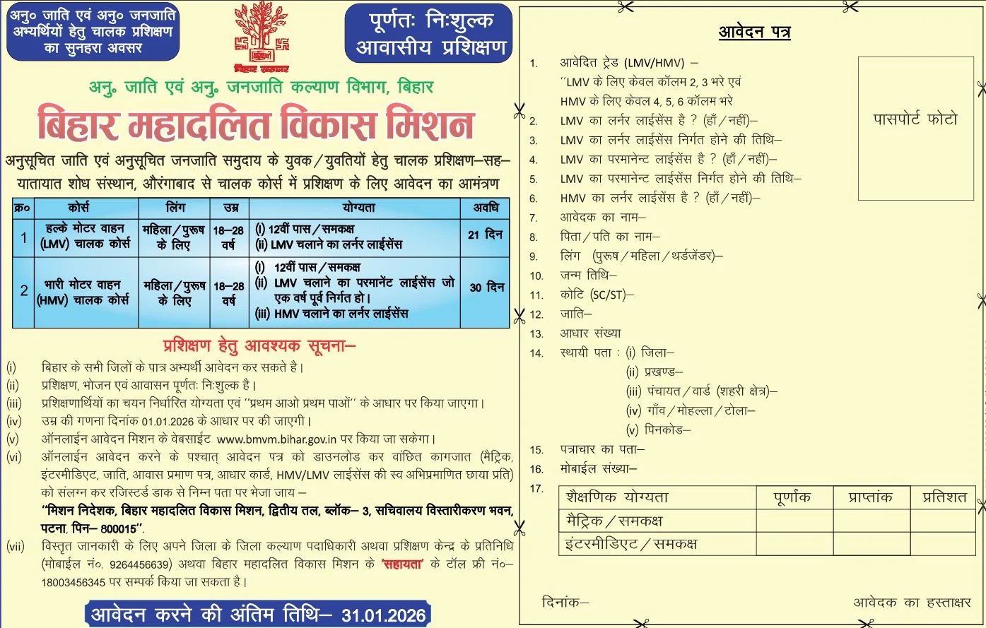 बिहार फ्री ड्राइवर प्रशिक्षण योजना 2026: क्या आप बिहार में अनुसूचित जातिया अनुसूचित जनजाति समुदाय के युवा लड़के या लड़की हैं? क्या आपके पास ड्राइविंग लाइसेंस है लेकिन आपको गाड़ी चलाना नहीं आता और आप सीखना चाहते हैं? अगर हाँ, तो आपके लिए अच्छी खबर है! बिहार सरकार ने बिहार महादलित विकास मिशन शुरू किया है, जिसके तहत अनुसूचित जाति और अनुसूचित जनजाति के युवा लड़के-लड़कियों को मुफ्त ड्राइविंग ट्रेनिंग दी जा रही है।