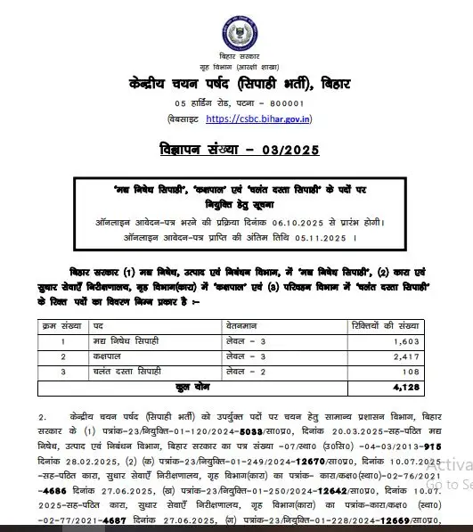 केंद्रीय चयन बोर्ड कांस्टेबल भर्ती 2025: CSBC ने बिहार पुलिस कांस्टेबल के कई अन्य पदों पर भर्ती के लिए अधिसूचना जारी कर दी है।  जिनमें कुल रिक्त पदों की संख्या 4361 रखा गया है। यह भर्ती इन पदों पर होंगे – मध् निषेद कांस्टेबल, जेल वार्डर और मोबाइल स्कायड कांस्टेबल आदि के पदों पर भर्ती होने वाले हैं। वैसे उम्मीदवार जो बिहार पुलिस में अपना सेवा देने के लिए इक्षुक हैं , वे उम्मीदवार दिनांक 06/10/2025 से लेकर दिनांक 05/11/2025 तक ऑनलाइन के माध्यम से आवेदन कर सकते हैं।  साथ ही इस आवेदन पत्र  से सम्बंधित सभी छोटी-बरी जानकारी जैसे – आयुसीमा, शैक्षणिक योग्यता, आवेदन शुल्क, चयन प्रक्रिया आदि सभी जानकारी के लिए निचे दिए गए लेख को ध्यान से पढ़ें, फिर आवेदन करें।