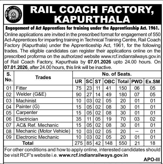 Rail Coach Factory Kapurthala Recruitment 2025: रेल कोच फैक्ट्री कपूरथला वैकेंसी 2025: अगर आप रेल कोच फैक्ट्री कपूरथला में काम करना चाहते हैं, तो आपके लिए बहुत अच्छी खबर है क्योंकि रेल कोच फैक्ट्री कपूरथला ने 550 खाली पोस्ट पर अप्रेंटिस पोस्ट की भर्ती के लिए ऑफिशियल नोटिफिकेशन जारी किया है, जिसमें कैंडिडेट 07 जनवरी 2026 तक ऑनलाइन अप्लाई कर सकेंगे। साथ ही, इस एप्लीकेशन फॉर्म से जुड़ी सभी जानकारी जैसे उम्र सीमा, एप्लीकेशन फीस, एजुकेशनल क्वालिफिकेशन, सिलेक्शन प्रोसेस वगैरह के लिए नीचे दिया गया आर्टिकल ध्यान से पढ़ें।